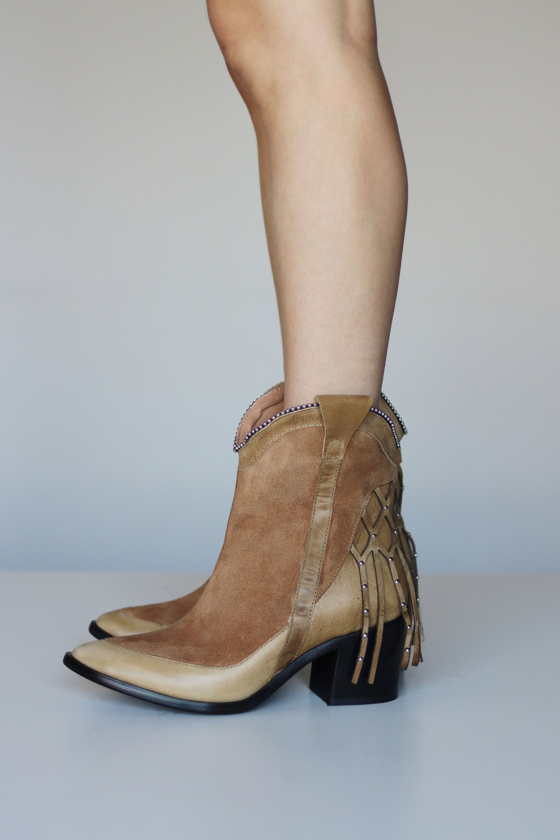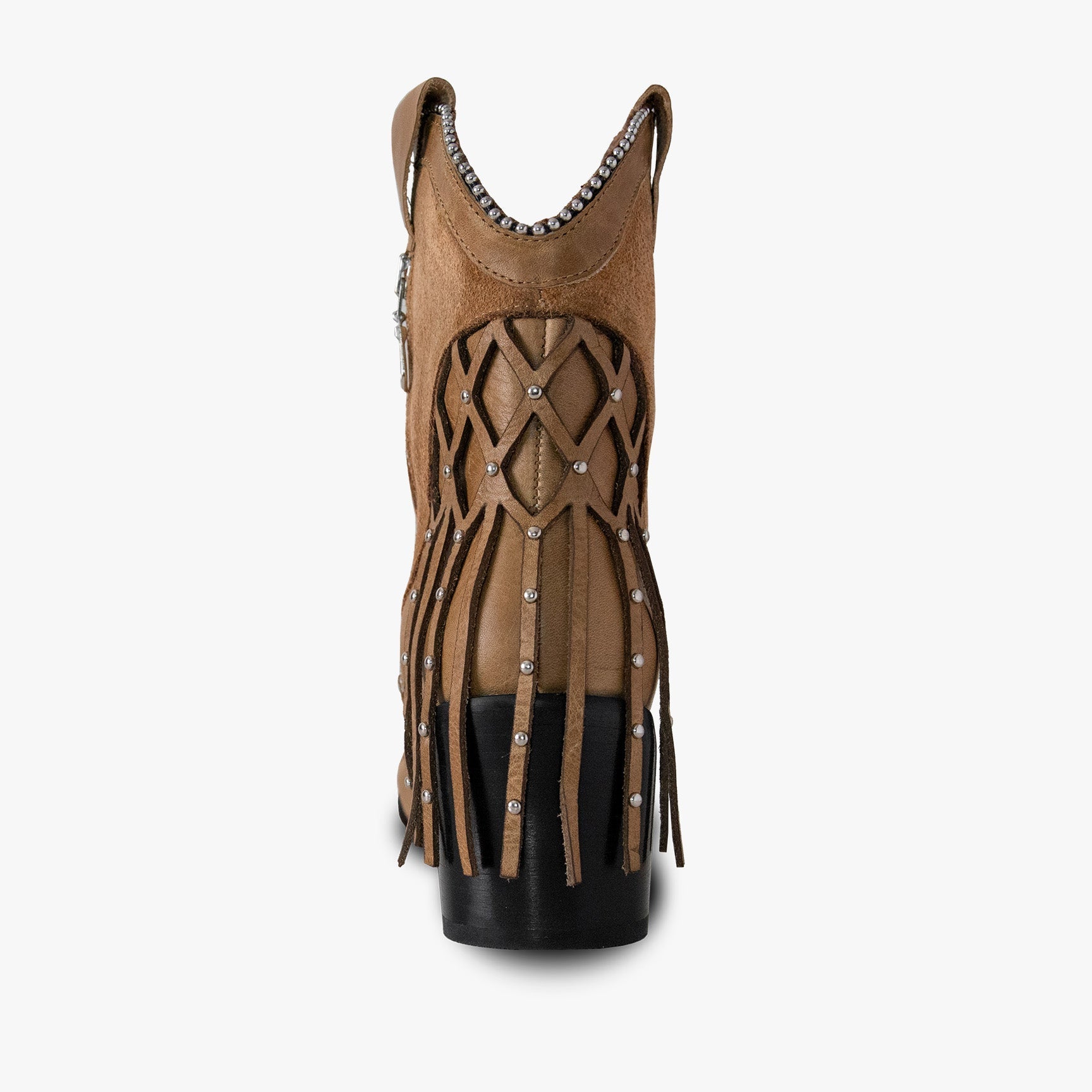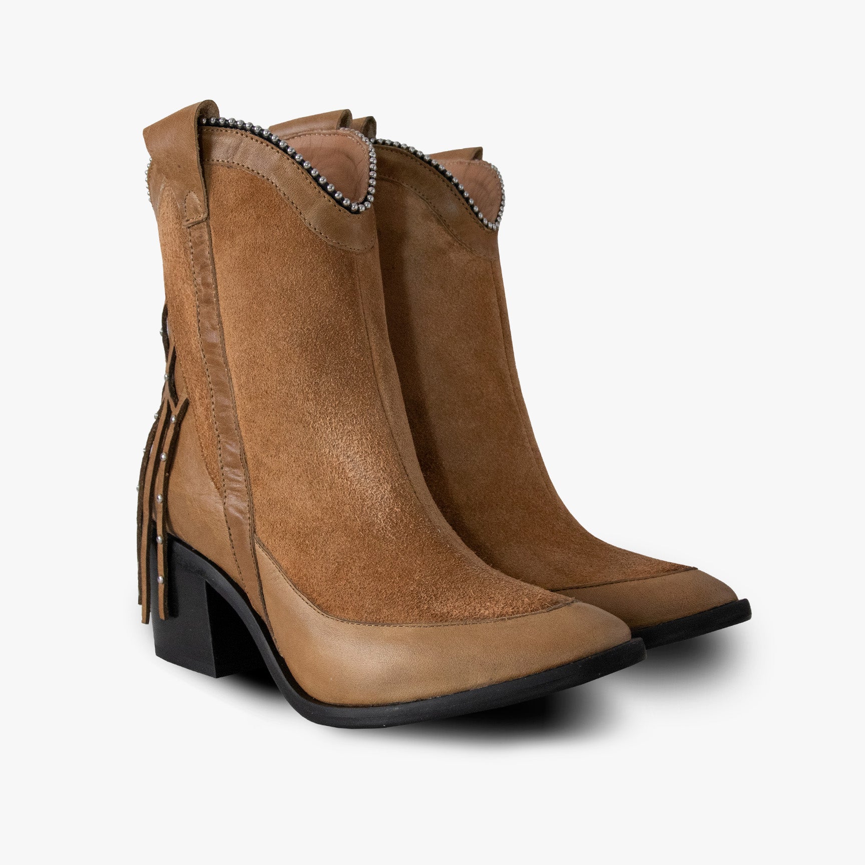 Everything that makes us, us; know in a bootie! Meet BALA SHORT CAMEL, in a soft brown textured leather, detailed with fringe and mini silver-colored studs at the back. A true masterpiece in every sense, created to elevate your looks. Set over our classic Western silhouette, available also in Black and Turquoise. -