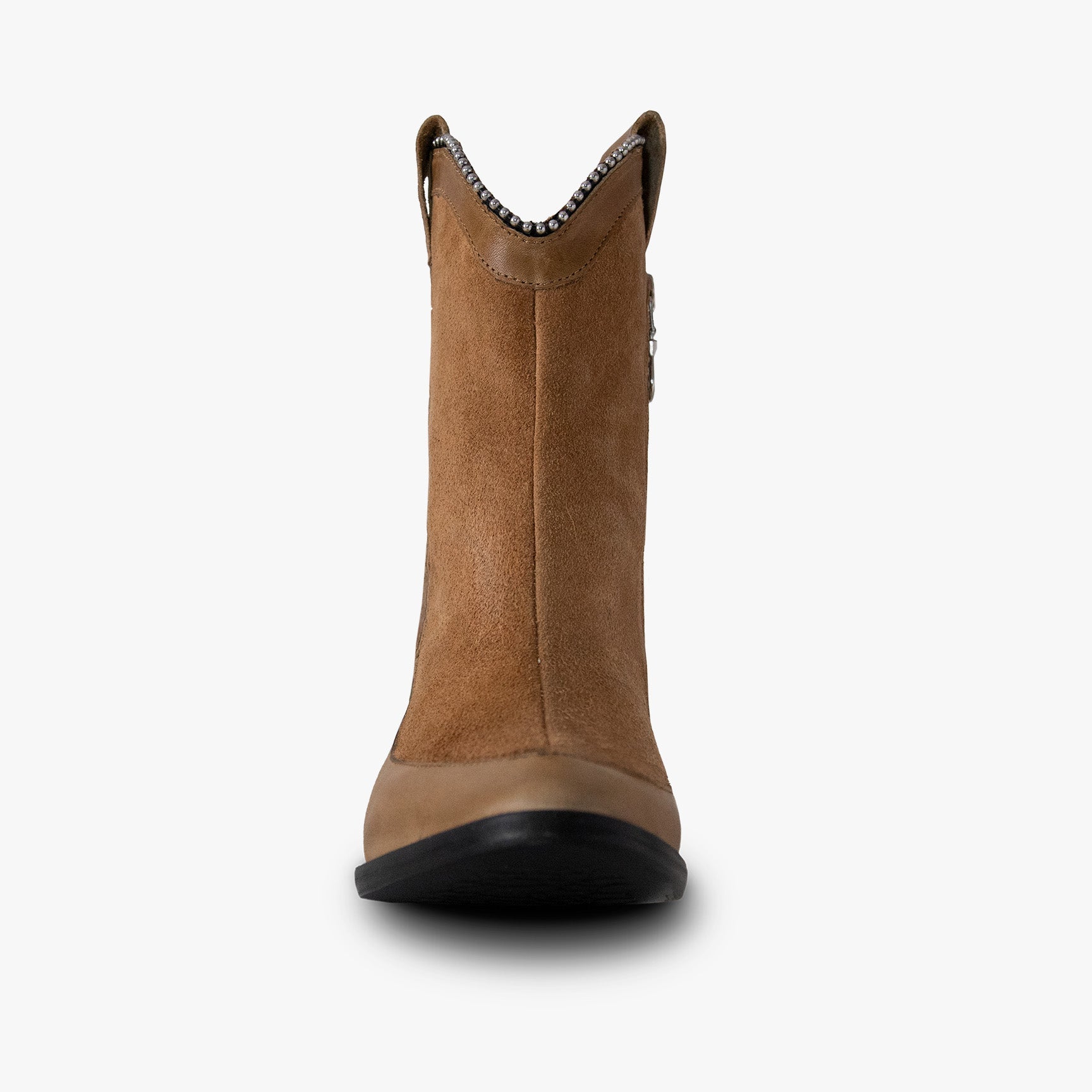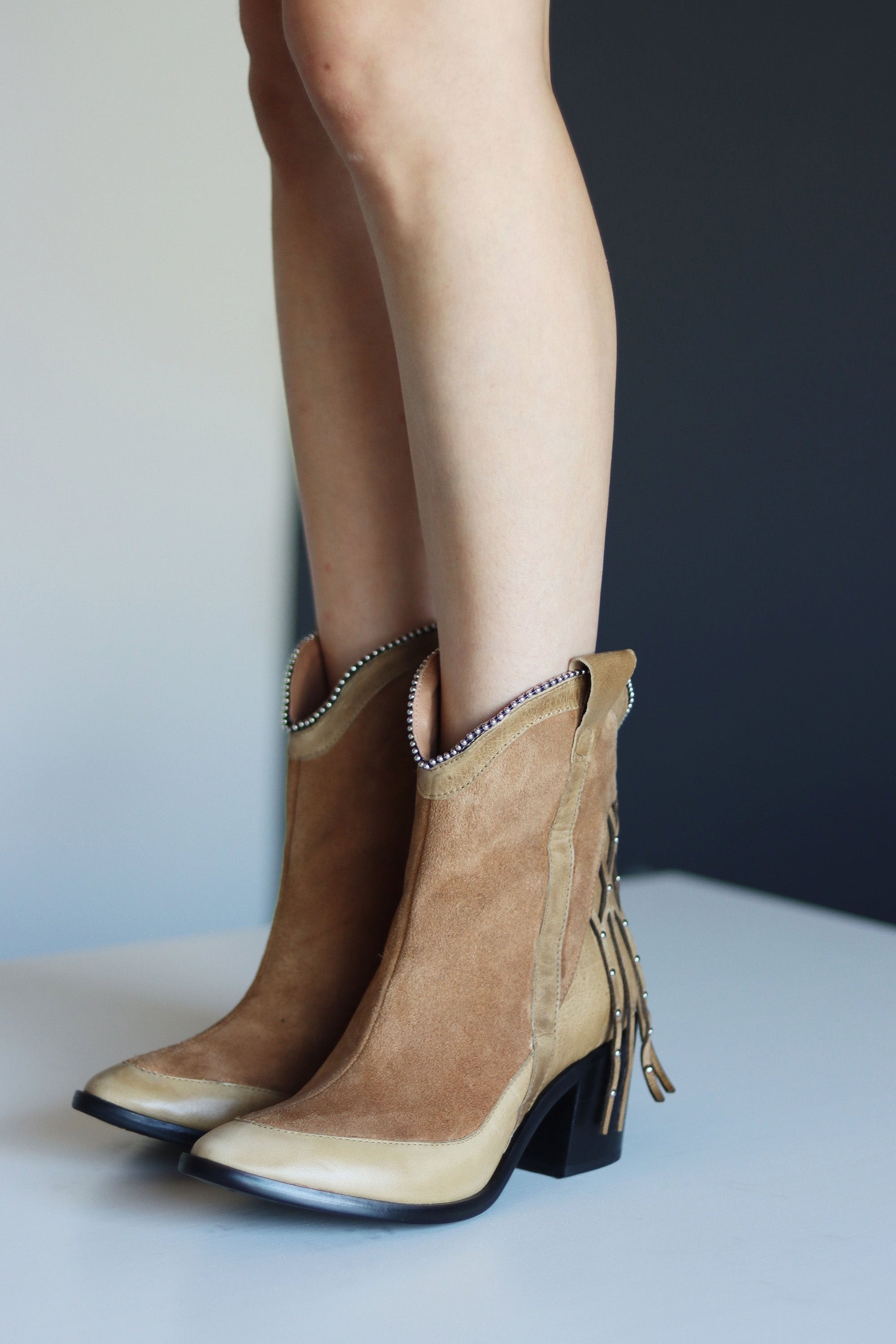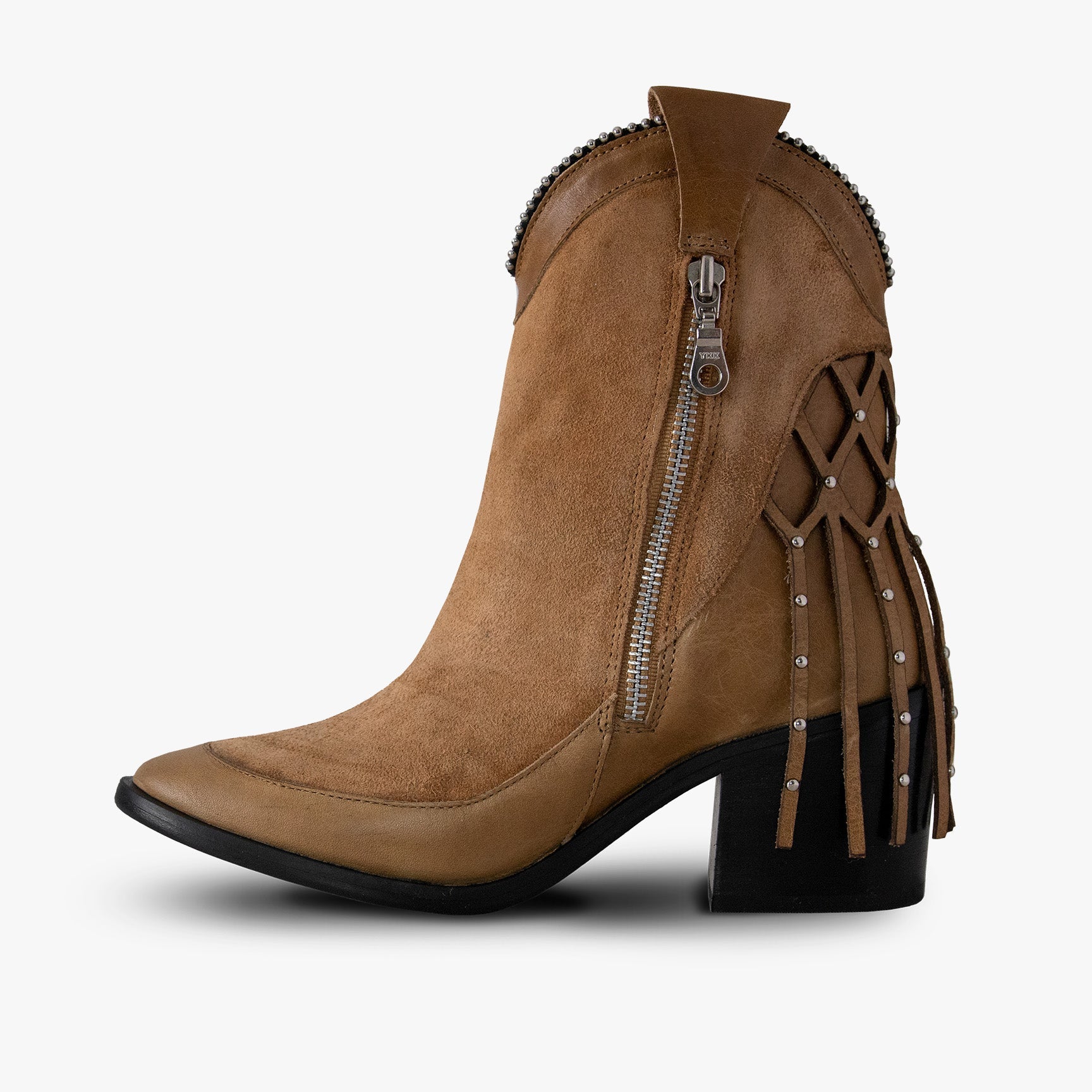 Everything that makes us, us; know in a bootie! Meet BALA SHORT CAMEL, in a soft brown textured leather, detailed with fringe and mini silver-colored studs at the back. A true masterpiece in every sense, created to elevate your looks. Set over our classic Western silhouette, available also in Black and Turquoise. -