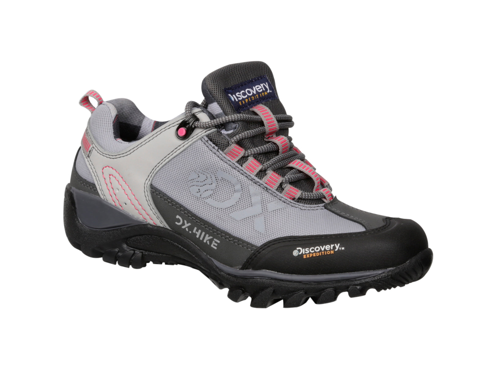 Discovery Expedition Women's hiking shoes made with high Tech materials, comfortable good looking shoes, grey and pink accent, ultrafresh technology.