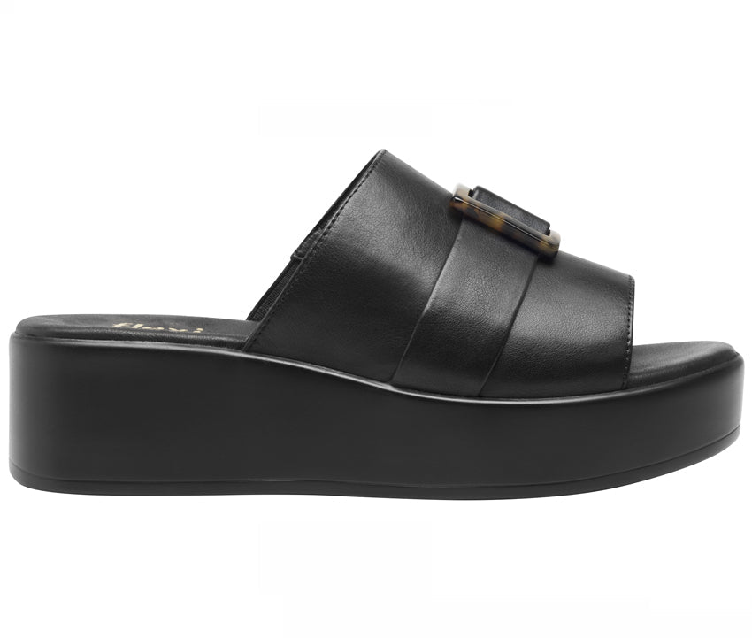 The Leather Slingback Sandal 116009 Black has the seal of comfort and style of Flexi shoes. This sandal is fashionably trendy yet provides great comfort with a cushioned leather insole. This shoe has a pu sole and pigskin lining.